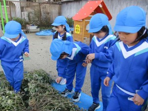 11月26日、年長組が、朝に先生たちが収穫した落花生を枝から取る作業を行いました...